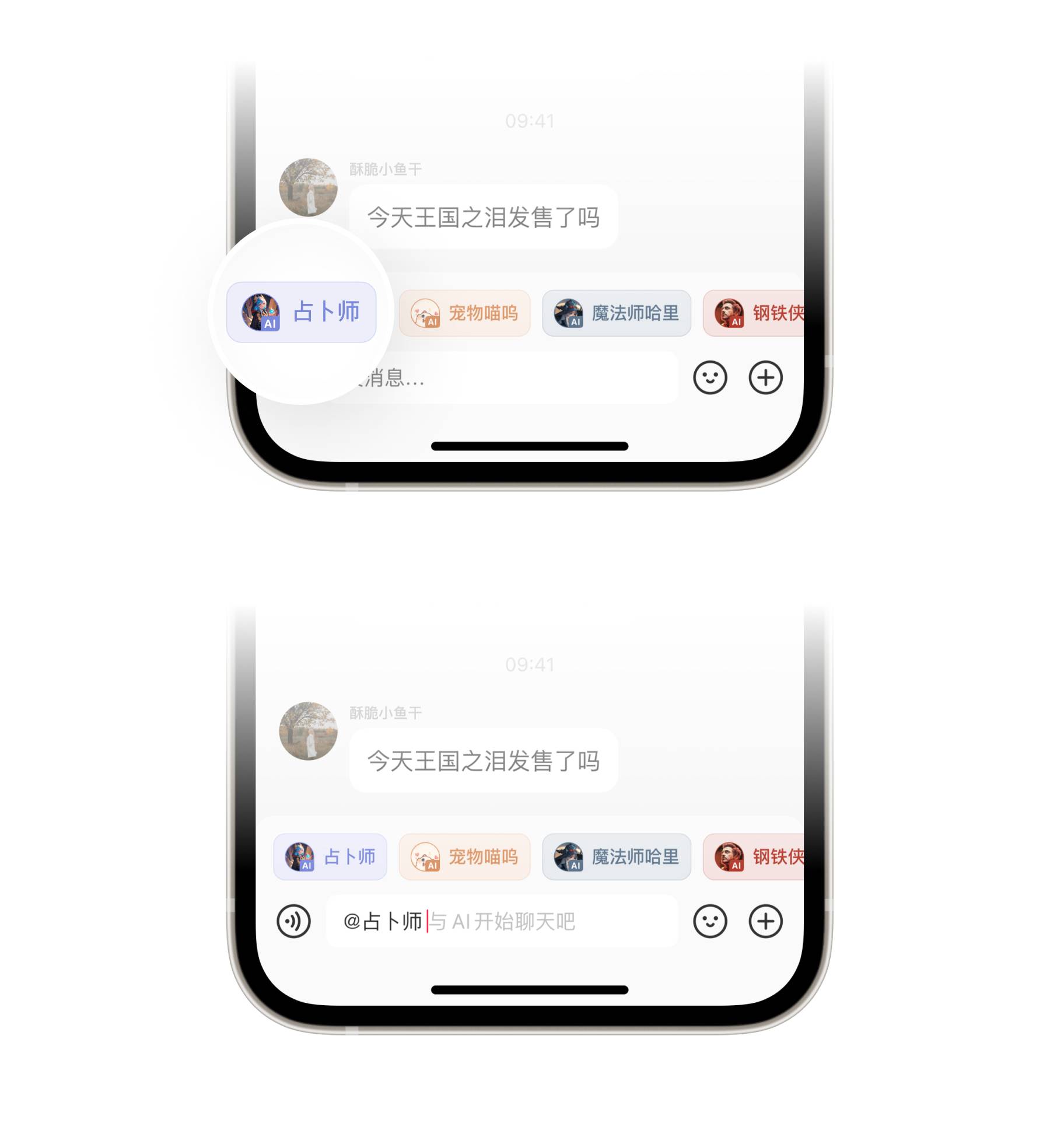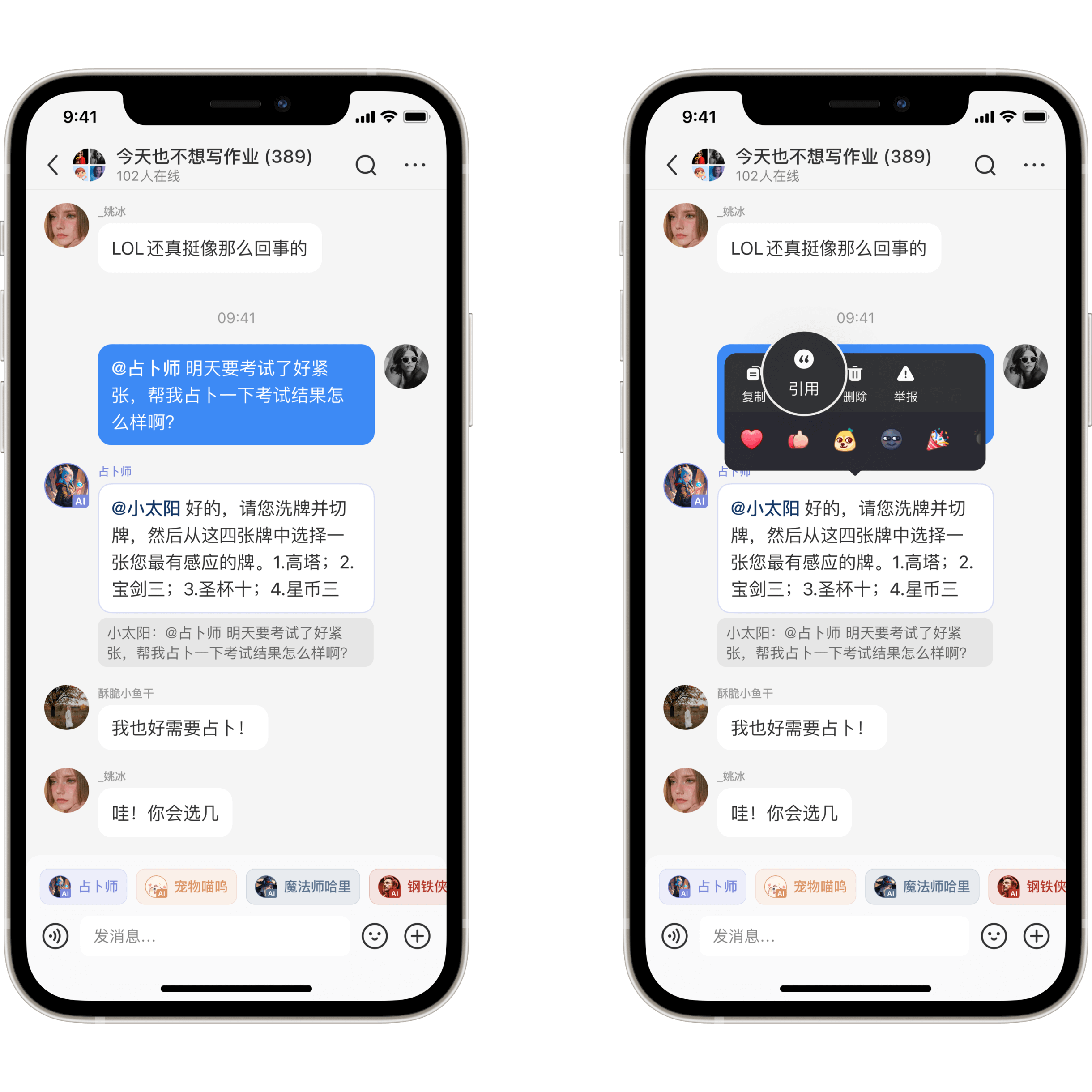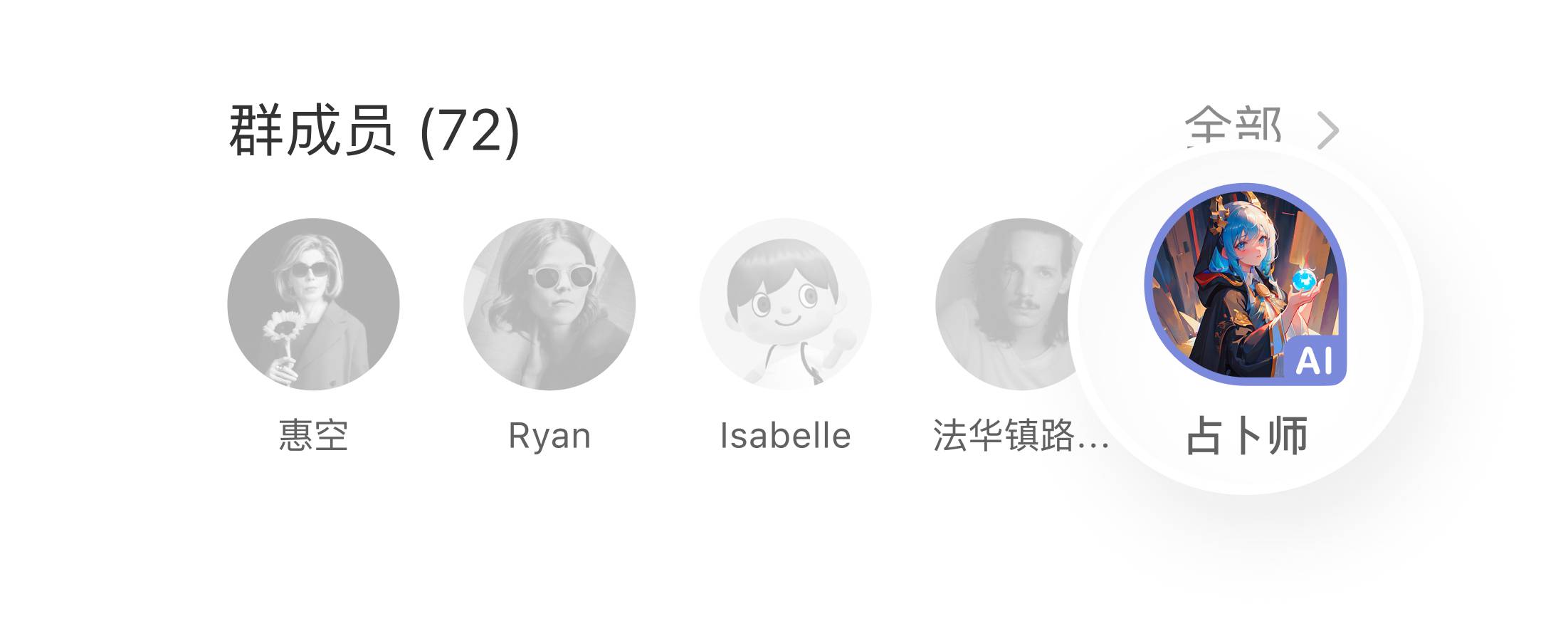 Starting with the avatar frame, we built a unique recognition system for AI. Group chat AI appears in all scenarios with a teardrop-shaped avatar, featuring a distinctive AI badge in the bottom right corner.