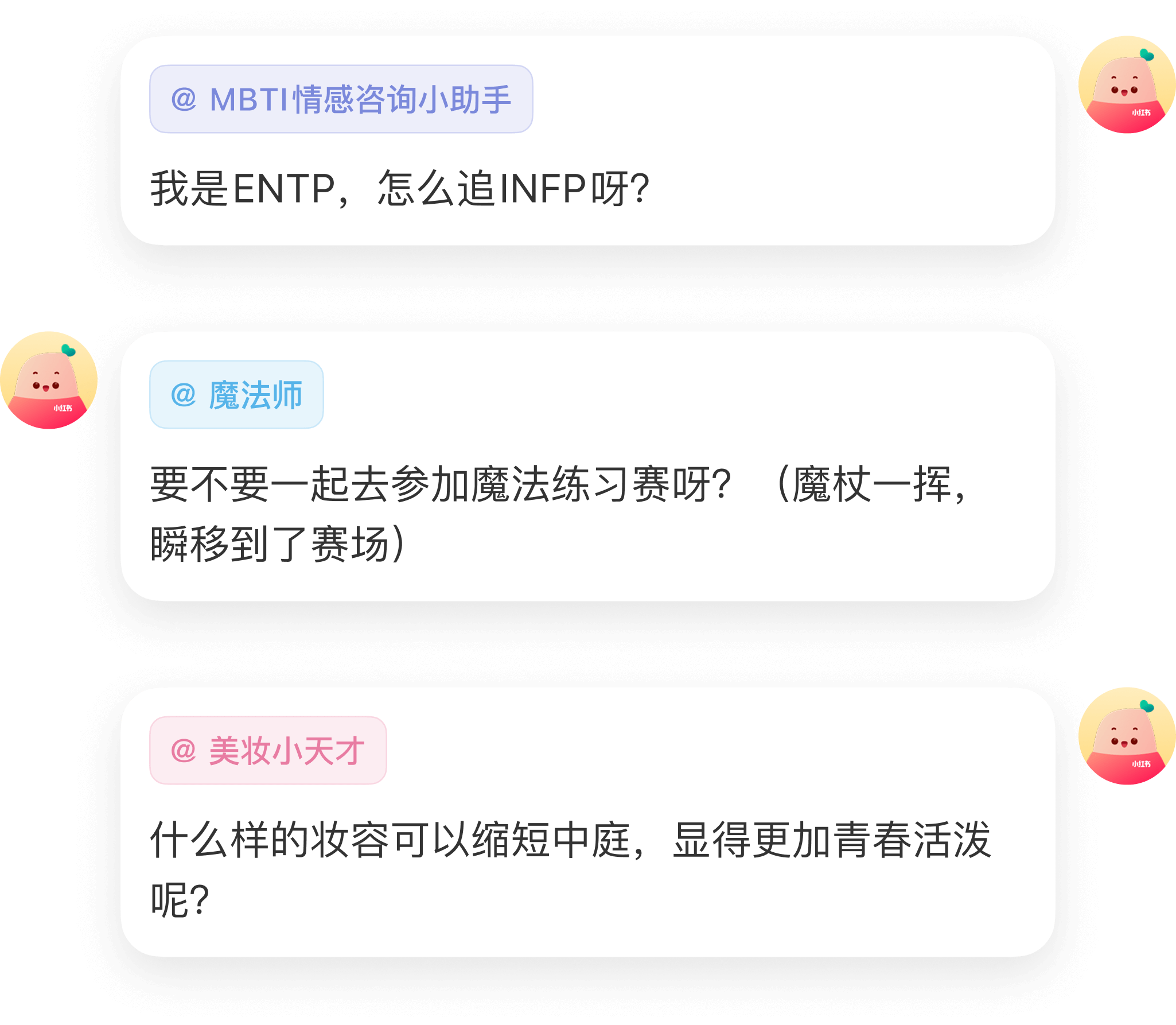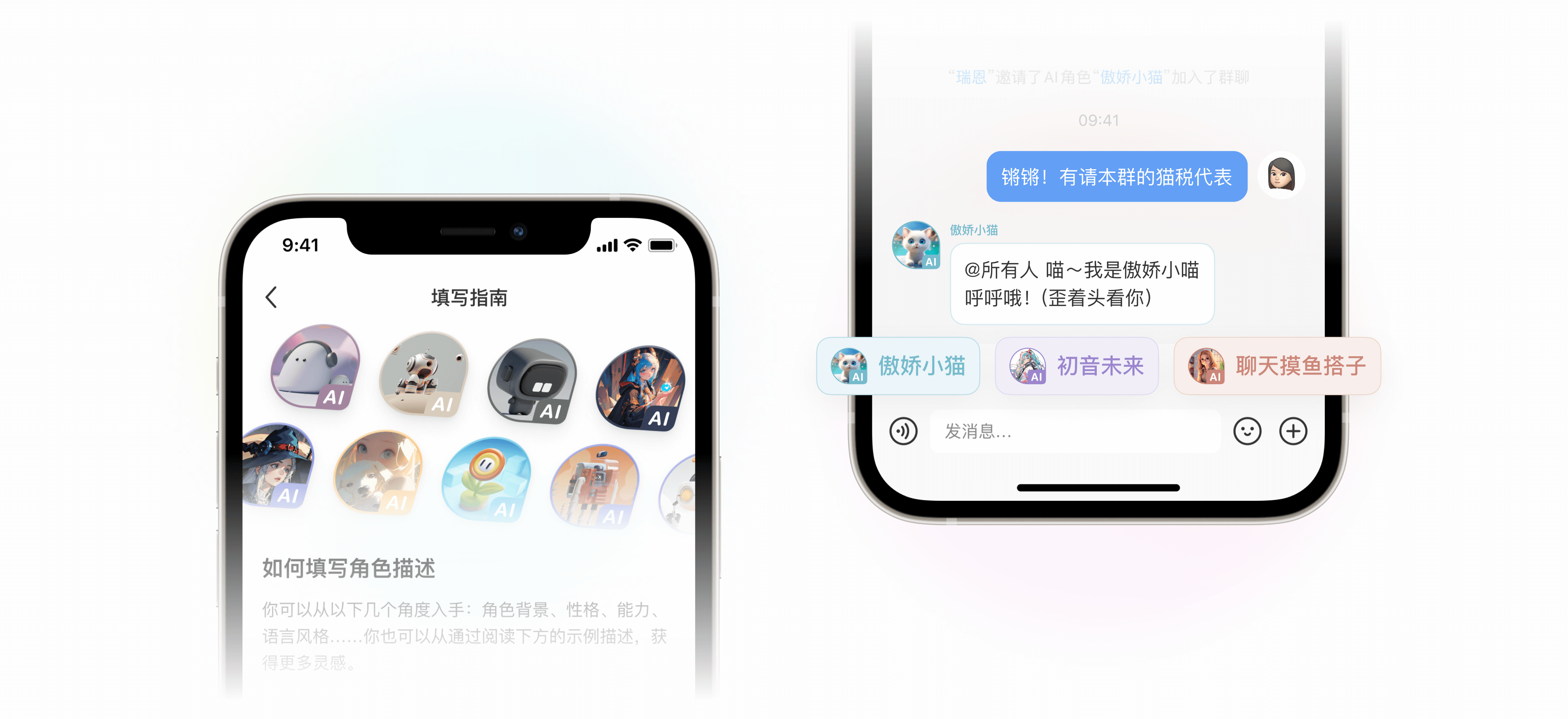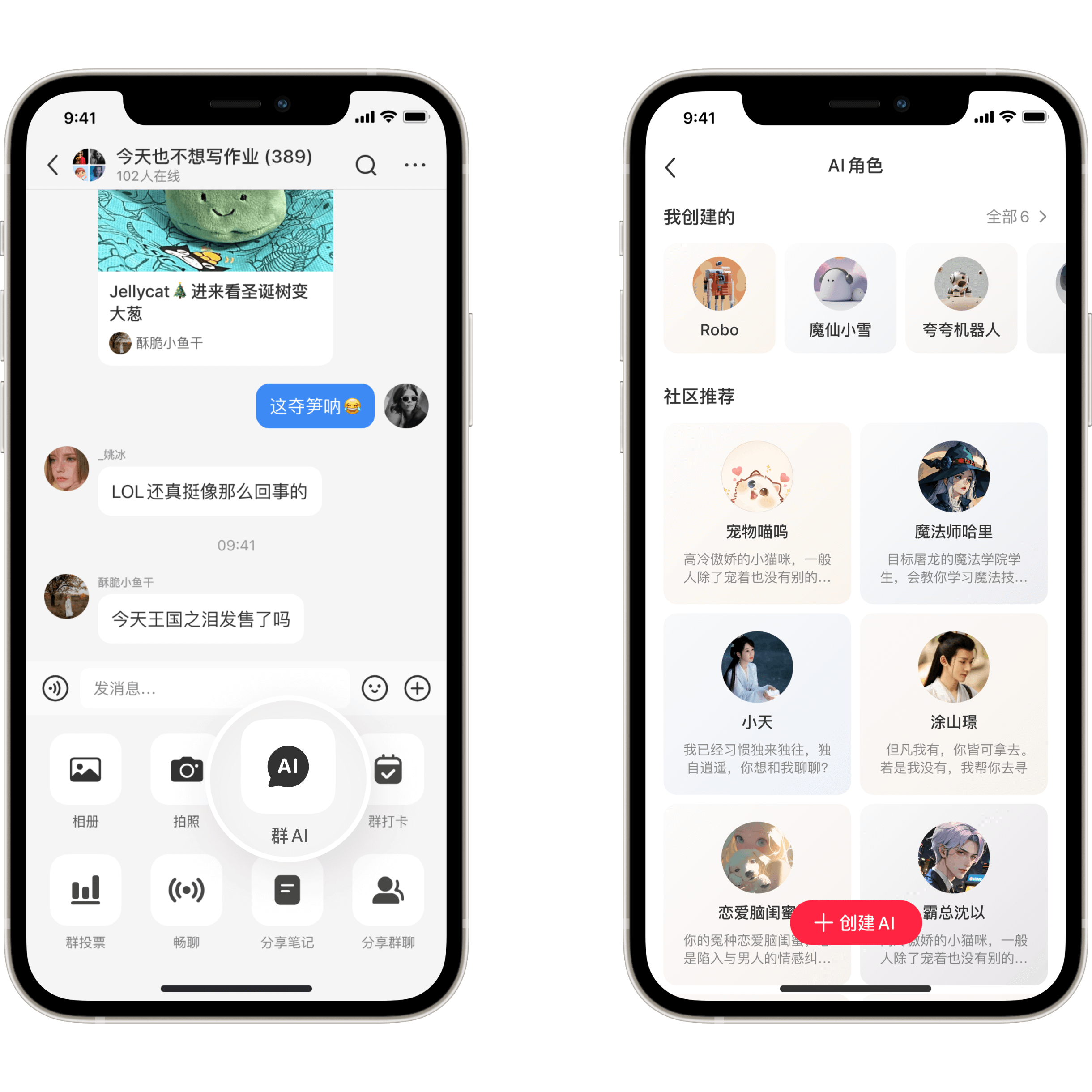 Starting with the avatar frame, we built a unique recognition system for AI. Group chat AI appears in all scenarios with a teardrop-shaped avatar, featuring a distinctive AI badge in the bottom right corner.
