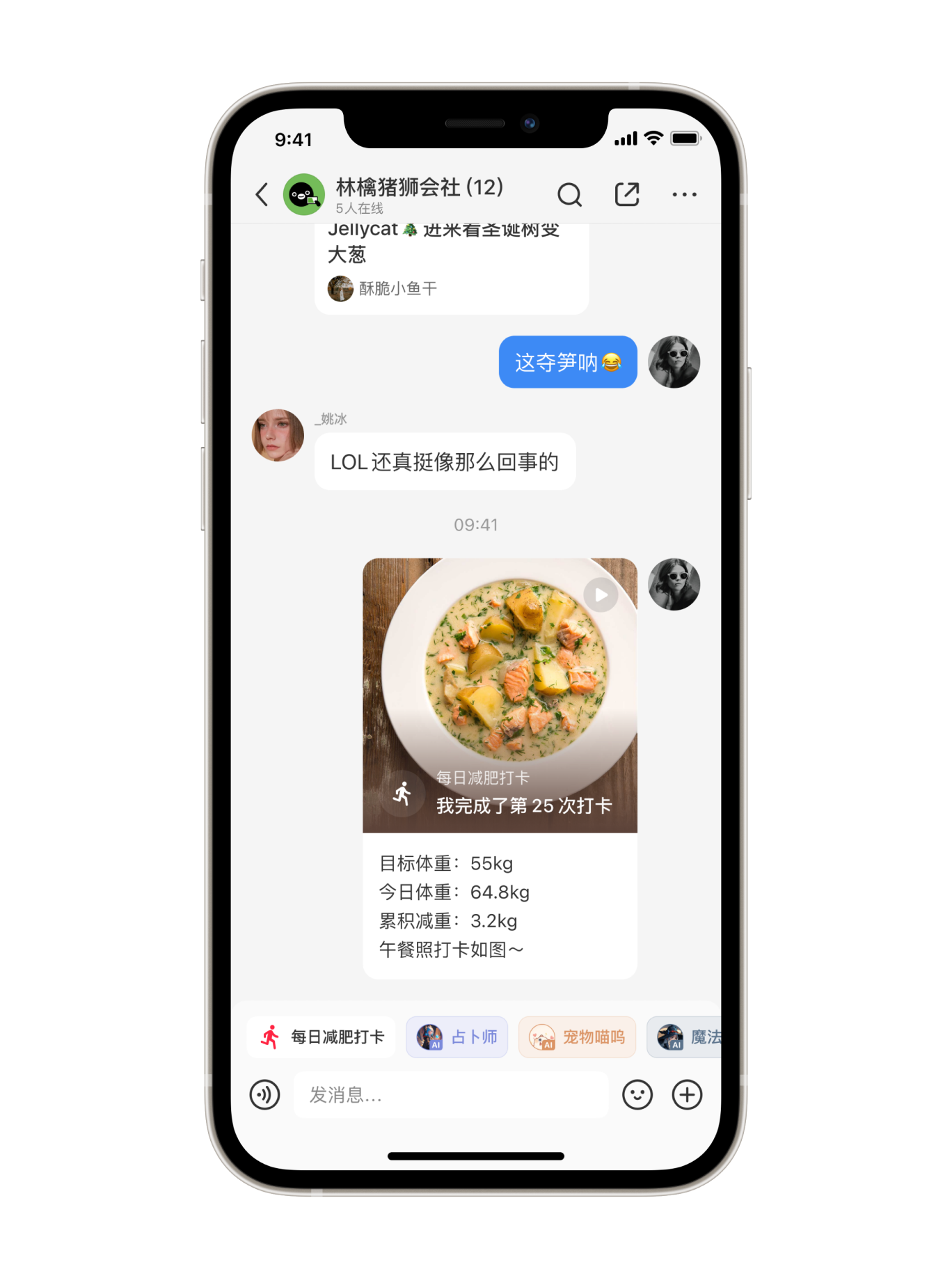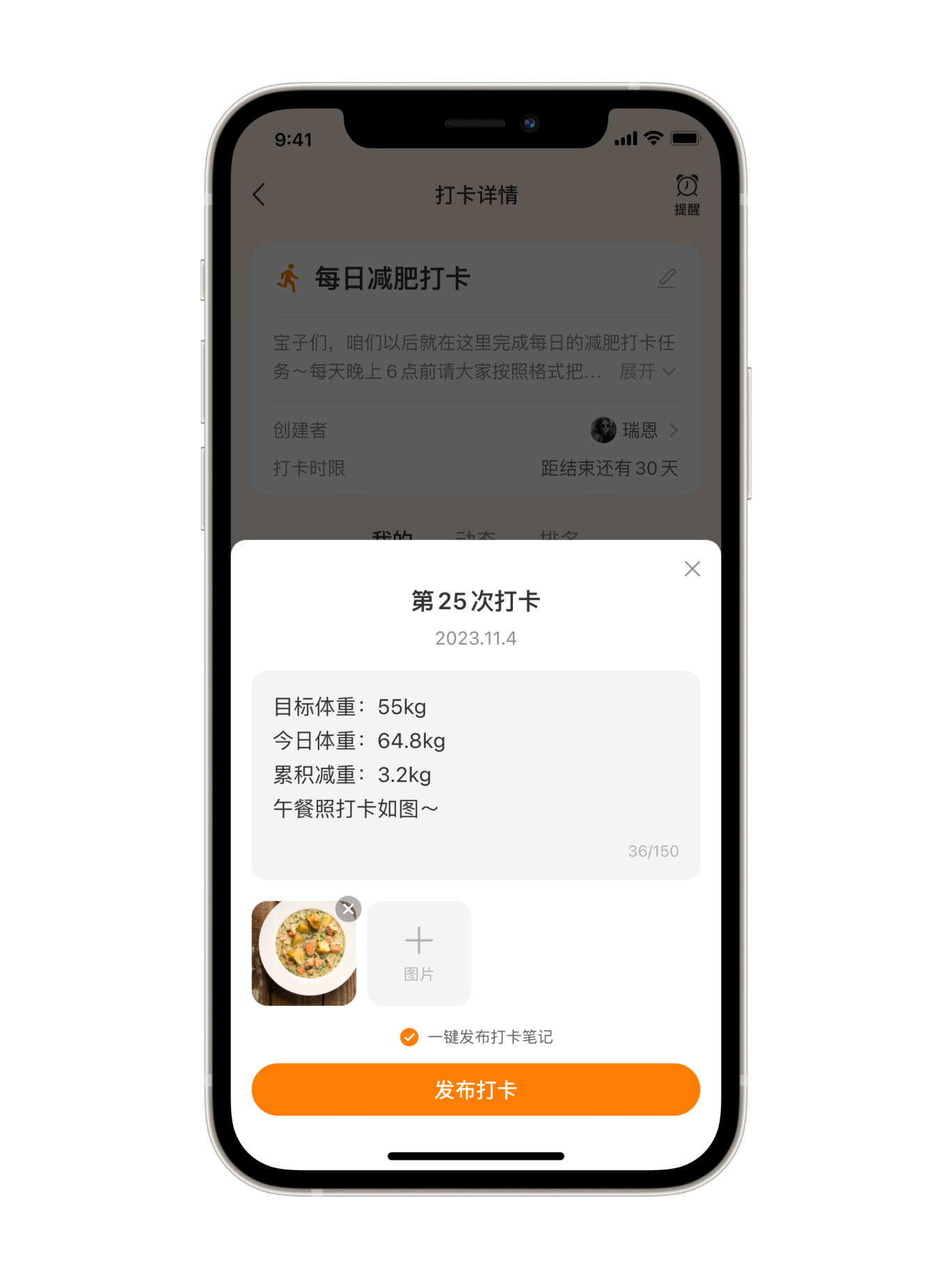 Check-ins go beyond just logging data—they’re shared moments. Users can add photos alongside text, and once a check-in is completed, it’s automatically posted to the group chat in a specially designed check-in card format. This ensures check-in updates stand out visually, encouraging others to engage and participate.