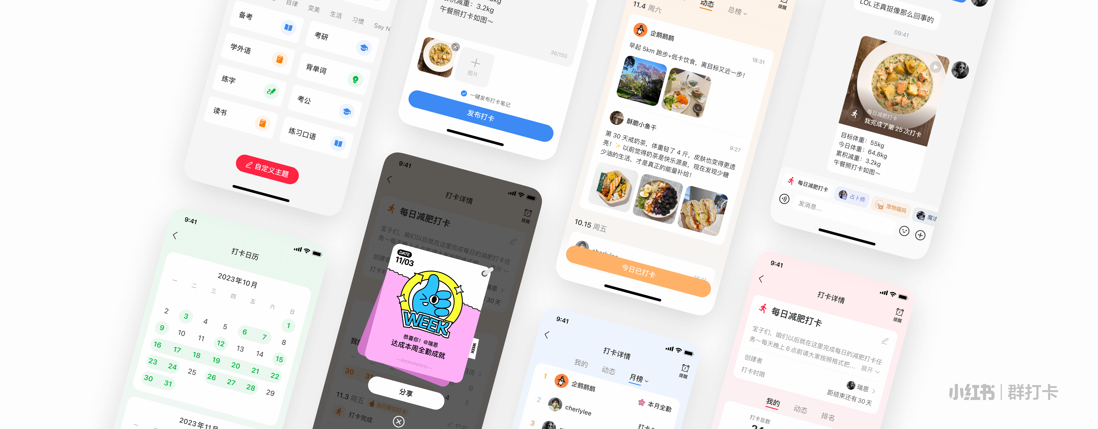 Group Check-in (群打卡) is a REDnote group chat feature which allows users to track their journey while fostering new habits, as well as share and engage with the community effortlessly. Throughout the entire development process, I took part as the lead designer, from early-stage concepts to final implementation.