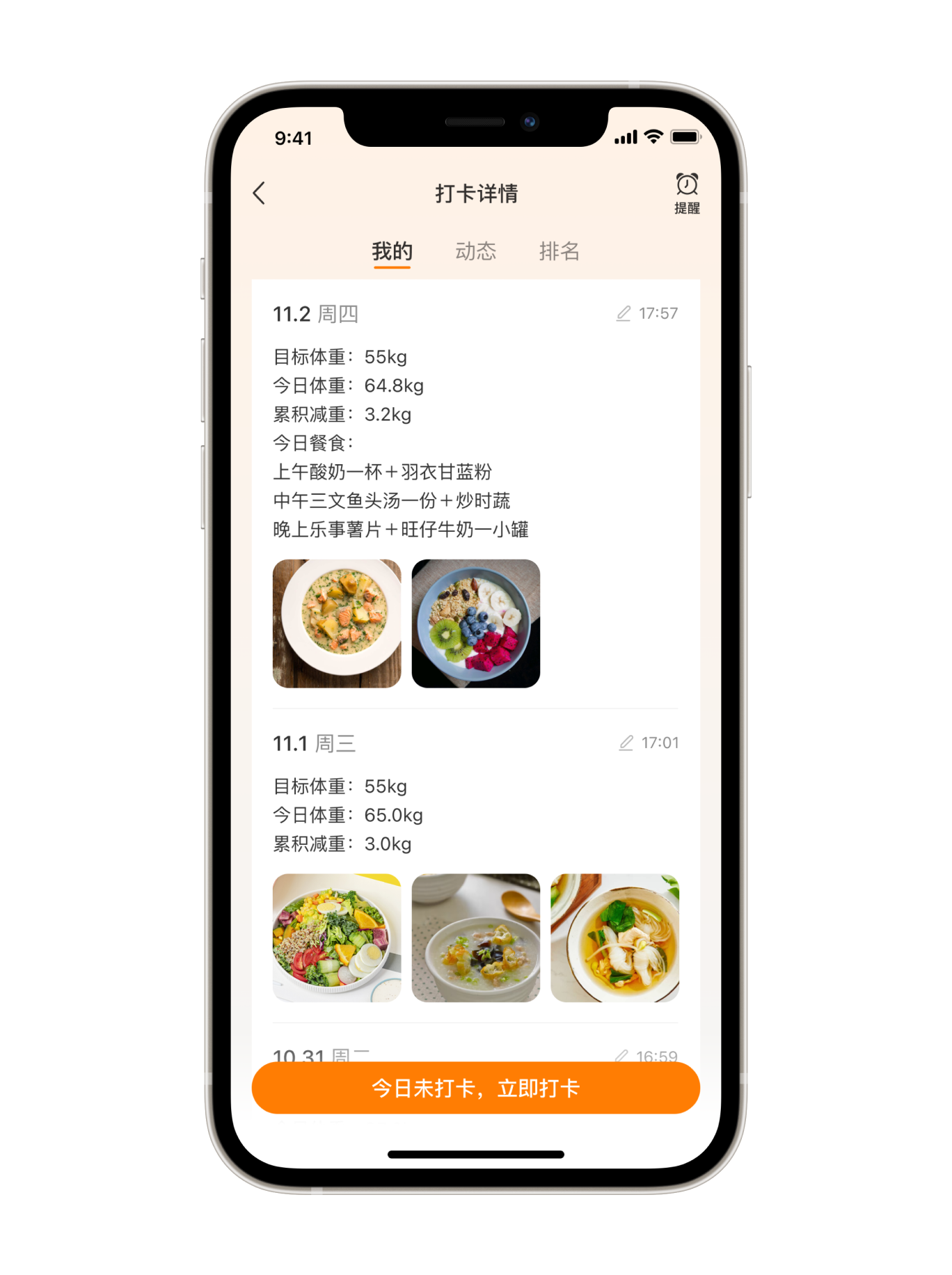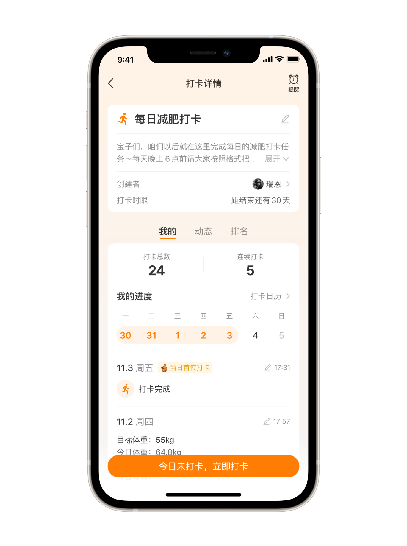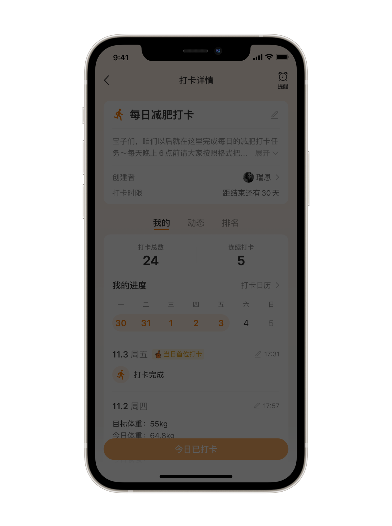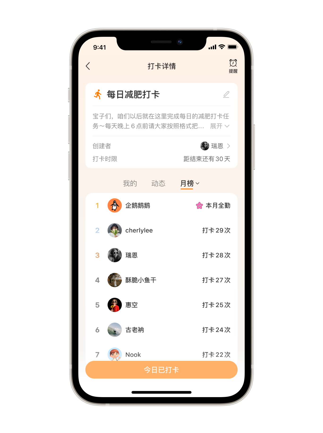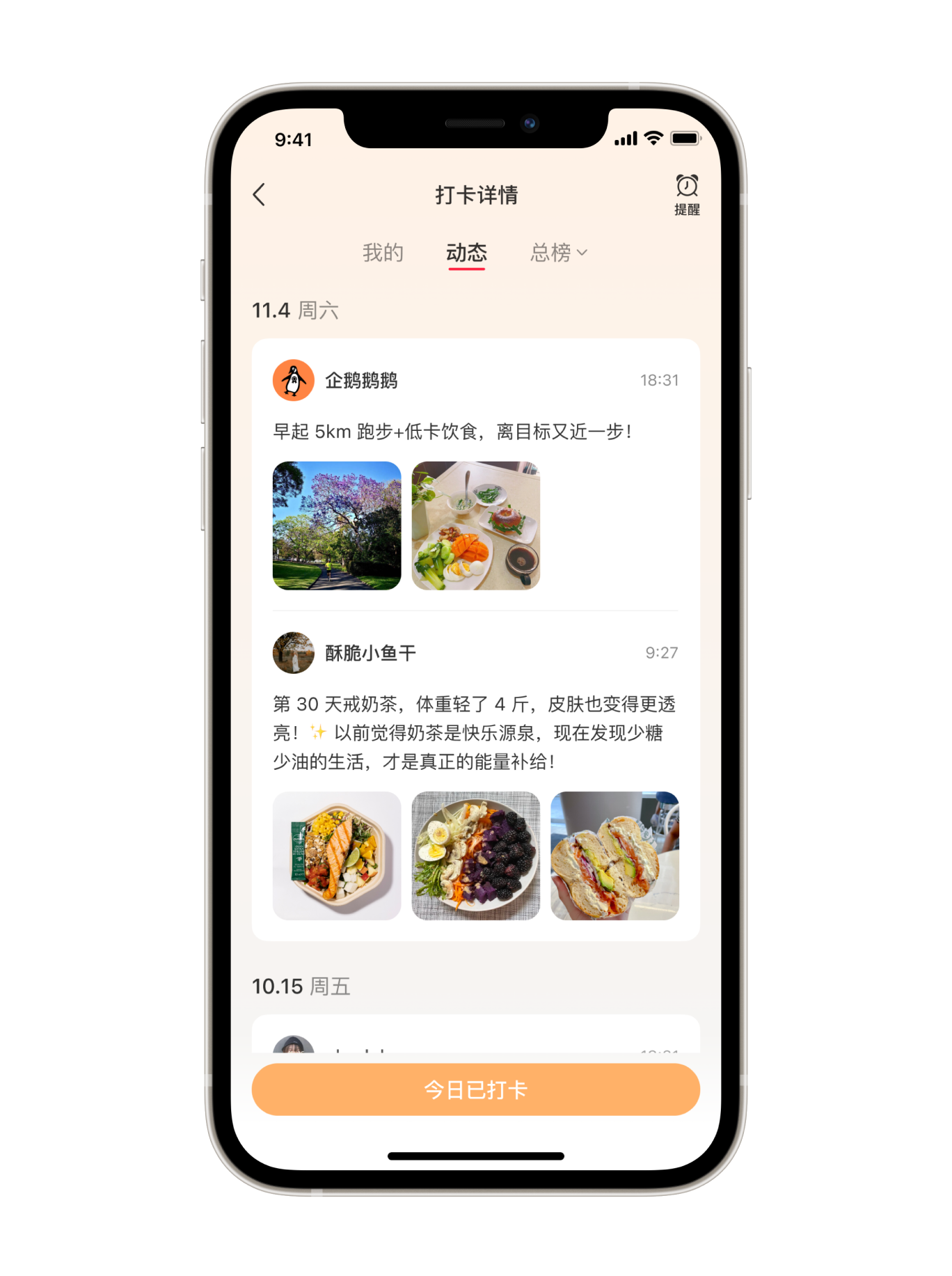 Get inspired by others’ progress. The check-in feed tab organizes all group check-ins in chronological order, making it easy to see what others are logging and stay engaged. And of course, every check-in is also shared in the group chat in real time through the check-in card system, keeping motivation high within the community.