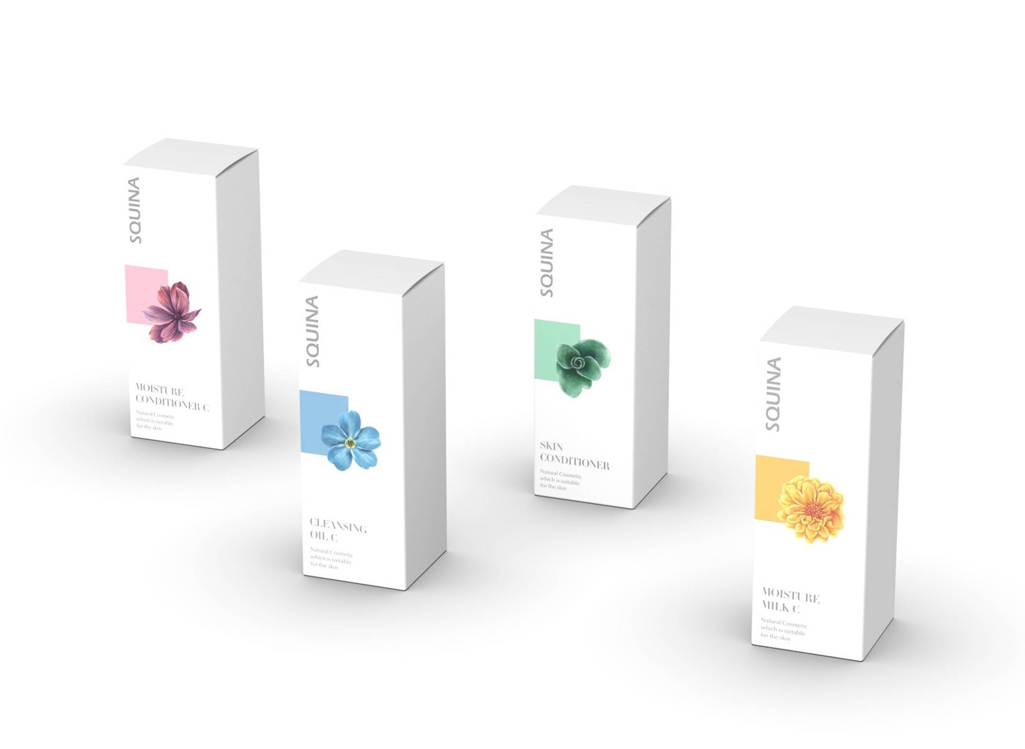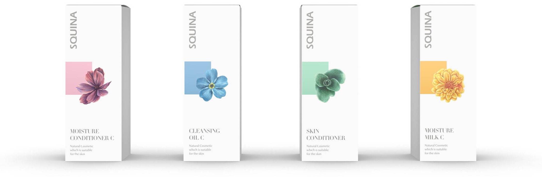 I designed a revised version of packaging for Squina Natural Desensitizing Skincare Series. The new design is elegant and graceful, indicating the series’ high-end flagship position. The revision tackles one great challenge – to differentiate products with packaging to create better legibility – using the element of flowers. So here’s the final design.