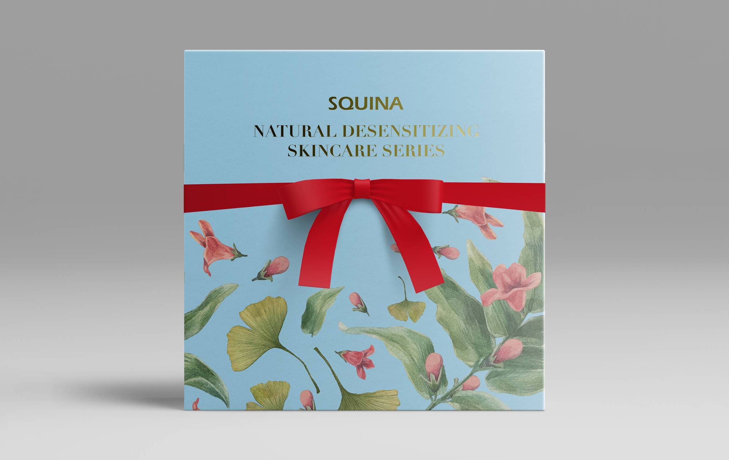 Besides the individual product packaging, there’s also a gift wrapping option. The gift box inherits the theme of individual packaging with watercolor flowers and Didot as the titling typeface. The gift box even more emphasizes the branding identity with more flowers and a golden title, contributing to a premium feel. The box is wrapped with a red ribbon expressing the care and wishes from the sender.